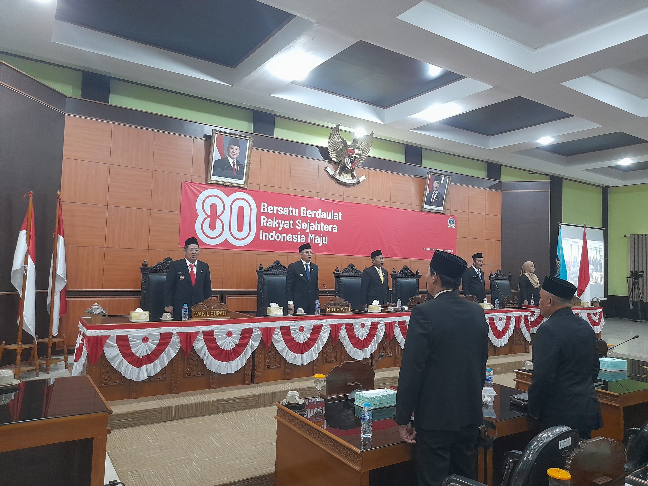 KOBA – Dewan Perwakilan Rakyat Daerah Kabupaten Bangka Tengah (DPRD Bateng) menggelar rapat paripurna istimewa mendengarkan pidato kenegaraan Presiden Prabowo Subianto dalamj rangka memperingati HUT RI ke-80 di Ruang Rapat Paripurna DPRD Bateng, pada Jumat (15/8/2025).