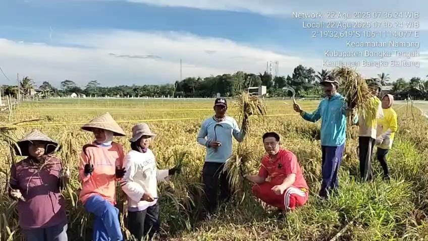 NAMANG – Petani Desa Namang, Kabupaten Bangka Tengah, mulai melakukan panen padi di lahan padi sawah desa, dalam program ketahanan pangan daerah tahun 2025.